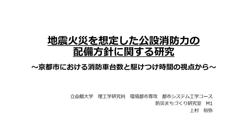 2023/05/16 カテゴリー 地震火災を想定した公設消防力の配備方針に関する研究 ~京都市における消防車台数と駆けつけ時間の視点から~ カテゴリー 2023年第2回定例研究会 発表内容 『地震火災を想定した公設消防力の配備方針に関する研究 ~京都市における消防車台数と駆けつけ時間の視点から~』 発 表 者 上村 裕弥(理工学研究科 博士課程前期課程 1回生) この記事をシェア