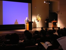 末川記念会館のホールにて開催された。ICCROM(文化財保存修復研究国際センター)のハーブ・ストーベル博士からは、「International perspectives in risk preparedness for cultural heritage」と題して国際的な枠組みからみた文化遺産保護の保存に関する視点について講演があった。東京藝術大学の益田兼房教授(立命館大学客員教授)からは、「京都の世界文化遺産と防災上の課題」と題して、京都の文化遺産のもつ防災上の問題点とそれに対する対策に関する講演がされた。また、センター長の土岐憲三教授(理工学部土木工学科)からは、「文化遺産の防災対策に係わる活動の現状」と題して、文化遺産保全の重要性と官民学がそれぞれ連携・協力してそれらを保全していく枠組みに関する講演がされた。文化遺産を核とした歴史都市の防災研究拠点に対する国際的、および社会的要請の大きさが伺われた。